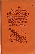Des Freiherrn v. Münchhausen wunderbare Reisen und Abenteuer zu Wasser und zu Lande. Berlin = Leipzig: Hermann Hillger Verlag, 1916 [Deutsche Jugendbücherei Nr. 70] Heft; Format 13,5 x 20,6; 32 Seiten Herausgegeben von den Vereinigten Deutschen Prüfungs-Ausschüssen für Jugendschriften Umschlagzeichnung von Ludwig Berwald Druck von Frankenstein & Wagner, Leipzig Deutschland [SCH 1916/02] |