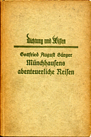 Des Freiherrn von Münchhausen wunderbare Reisen und Abenteuer zu Wasser und zu Lande. Dortmund: Druck und Verlag von W. Crüwell, 1928 [Dichtung und Wissen. Crüwells Sammlung wertvoller Lesestoffe für Schule und Haus, 1. Reihe, Band 12] Pappband; Format 12,3 x 18,5; 57 Seiten St: Staedt. Volksschule Overbergschule Dortmund Deutschland [SCH 1928/07] |