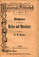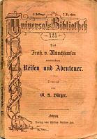 Des Freih. v. Münchhausen wunderbare Reisen und Abenteuer zu Wasser und zu Lande, wie er dieselben bei einer Flasche im Zirkel seiner Freunde zu erzählen pflegte. Leipzig: Druck und Verlag von Philipp Reclam jun., 1869 [Reclams Universal-Bibliothek Band 121] Broschur; Format 9,9 x 14,9; 98 + 2 Seiten Literatur: Wackermann 1.52 Besitzervermerk: Luise Mayer Deutschland [Sammlung Friedrich Janshoff] |