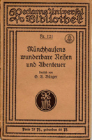Des Freih. v. Münchhausen wunderbare Reisen und Abenteuer zu Wasser und zu Lande, wie er dieselben bei einer Flasche im Zirkel seiner Freunde zu erzählen pflegte. Leipzig: Druck und Verlag von Philipp Reclam jun., 1914 [Reclams Universal-Bibliothek Band 121] Broschur; Format 9,9 x 14,9; 98 + 2 Seiten Literatur: Wackermann 1.52 Besitzervermerk: M? Reinartz, Coeln 1915 Deutschland [SCH 1915/01] |
