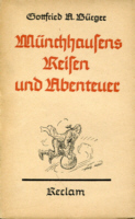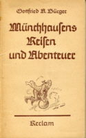 Leipzig: Verlag von Philipp Reclam jun., 1943 [Reclams Universal-Bibliothek 121.121a] Broschur; Format 9,5 x 15,4; 143 + 1 Seiten Nebst einem Anhang Lügengeschichten aus älterer Zeit. [Titelvignette von Fritz Fischer] Gesetzt in der Breitkopf-Fraktur. Printed in Germany 1943. Reclam-Druck Leipzig. Deutschland [SCH 1943/20] |
