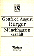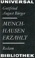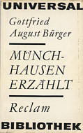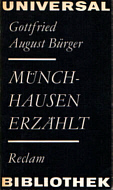 Wunderbare Reisen zu Wasser und Lande, Feldzüge und lustige Abenteuer des Freiherrn von Münchhausen. Wie er dieselben bei der Flasche im Zirkel seiner Freunde selbst zu erzählen pflegt. Leipzig: Verlag Philipp Reclam jun., 1983 [Reclams Universal-Bibliothek 121] [Verlags-Nr. 660 071 4] 7. (recte 8.) Auflage Taschenbuch; Format 10,7 x 17,7; 99 + 3 Seiten Textkritisch bearbeitet und mit einem Nachwort von Curt Noch Text nach: Wunderbare Reisen zu Wasser und Lande, Feldzüge und lustige Abenteuer des Freyherrn von Münchhausen, wie er dieselben bey der Flasche im Zirkel seiner Freunde selbst zu erzählen pflegt. London (Göttingen) 1786: und nach der zweiten, vermehrten Ausgabe, London (Göttingen) 1788 Mit 16 Illustrationen von Renate Totzke-Israel © Reclam-Verlag Leipzig 1981 - Reihenentwurf: Irmgard Horlbeck-Kappler - Gesetzt aus der Garamond-Antiqua - Printed in the German Democratic Republic - Lizenz Nr.363.340/152/83 LSV 7101. Vbg. 5,6 - Grafischer Großbetrieb Völkerfreundschaft Dresden DDR [SCH 1983/07 |
